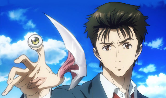 It have an story like the one with Kaneki he is a normal human boy a little shy, you know normal teens things but a night a little animal a parasyte that tries to get the control of its body but in his try to get to the brain he finds obstruction and he couldn't he takes over Shinichi right hand and with his hands he changes but not all to bad if not to make this a super badass character that's not afraid of killing anymore.